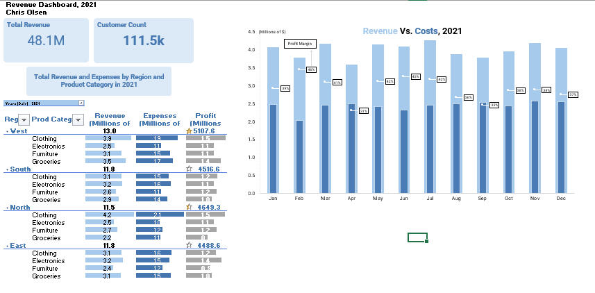 This dashboard compares company overall revenue and costs, as well as by region and product type. The chart on the right also has the profit margin % for that month.