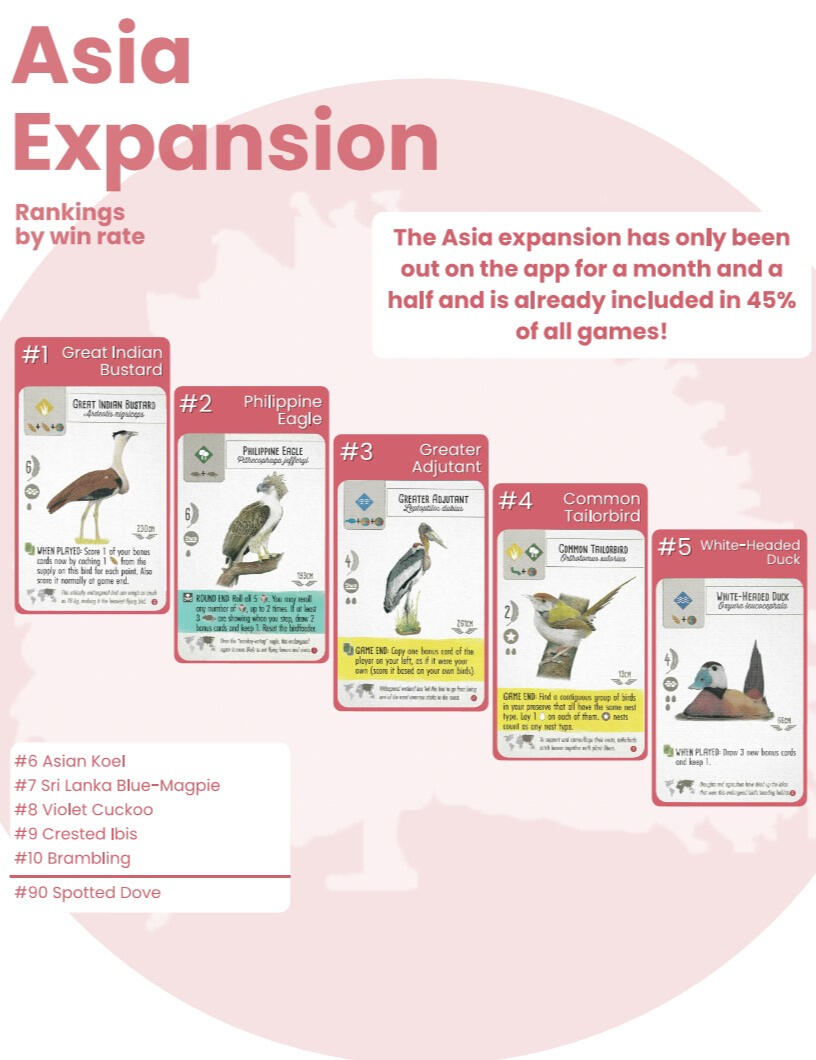 I analyzed data sent to me by board game publisher Stonemaier Games from their digital version of their hit board game Wingspan (one of my favorite games).