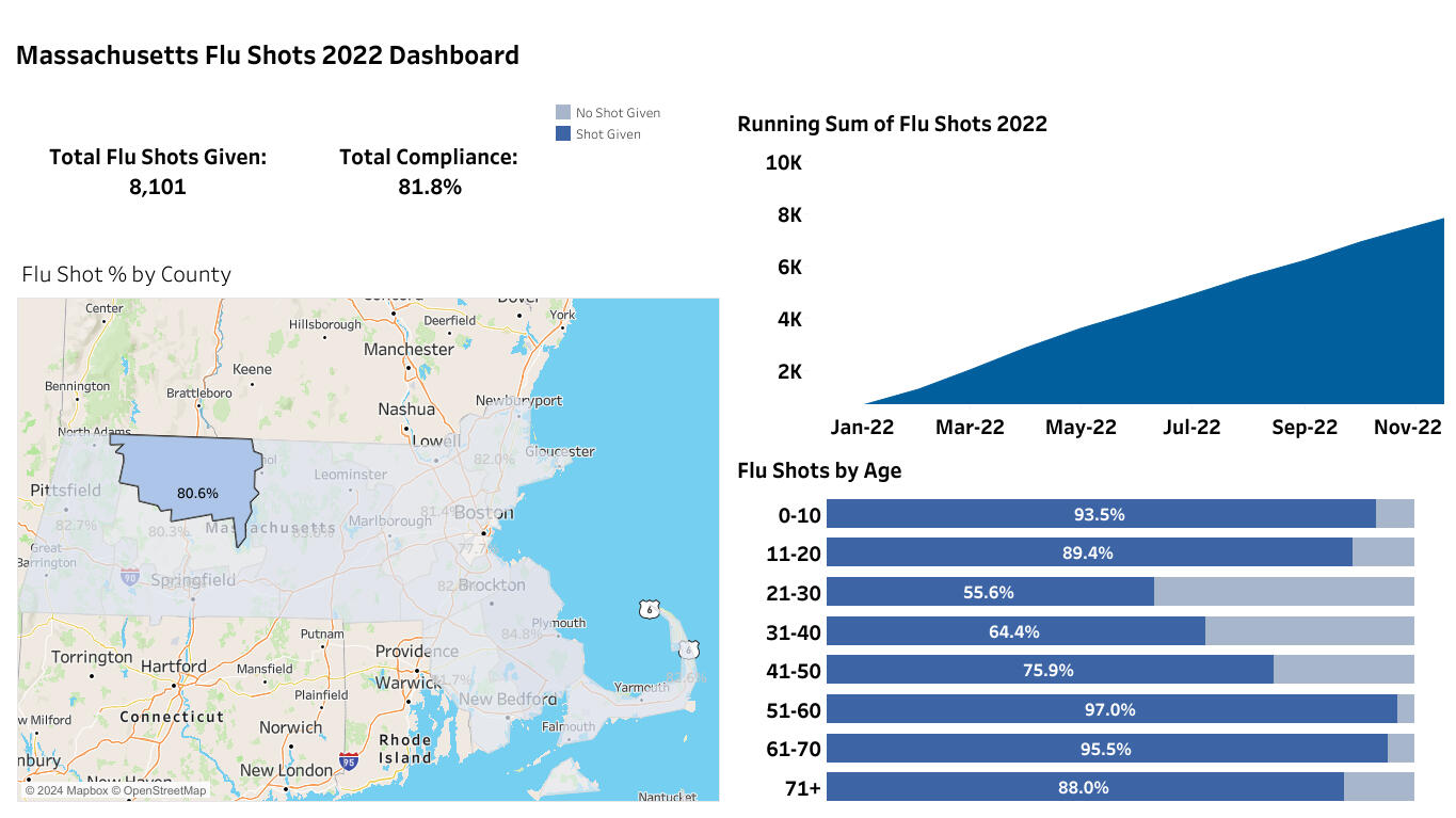 -Developed to track the number and percentage of flu shots given to hospital patients, flu shot percentages by age group, and by county.