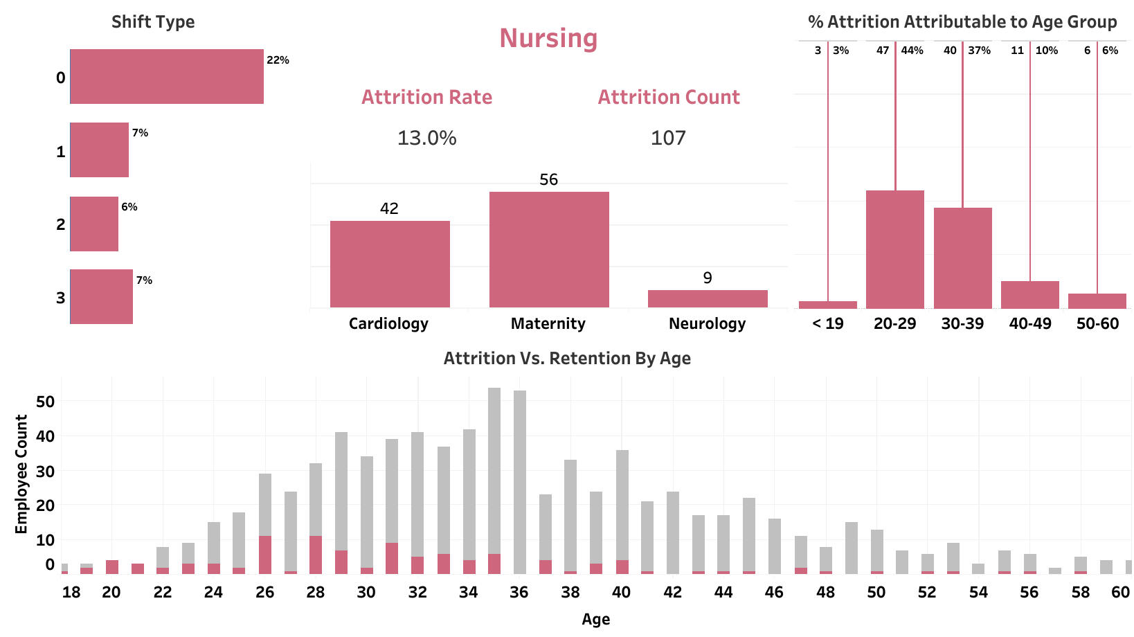 This dashboard monitors hospital nurse attrition rates by age range, job role, department, and shift type.